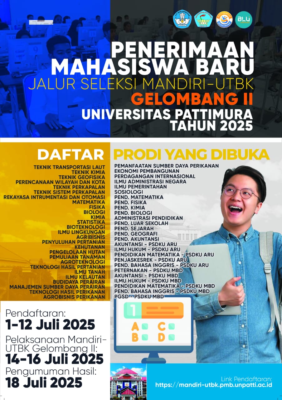 Seleksi Mandiri Jalur Tes merupakan seleksi masuk perguruan tinggi yang dilakukan berdasarkan hasil Ujian Tulis Berbasis Komputer (UTBK) dan dapat ditambah dengan kriteria lain sesuai dengan ketentuan yang ditetapkan Universitas Pattimura. Seleksi diperuntukkan bagi calon mahasiswa Lulusan SMA/MA/SMK/Sederajat tahun 2023, 2024 dan 2025 atau peserta didik Paket C tahun 2025 dengan maksimal umur 25 Tahun untuk program Reguler atau bagi calon mahasiswa Lulusan SMA/MA/SMK/Sederajat di atas 3 tahun terakhir/sementara bekerja untuk program Non Reguler, melalui Ujian Tulis Berbasis Komputer (UTBK).
